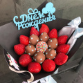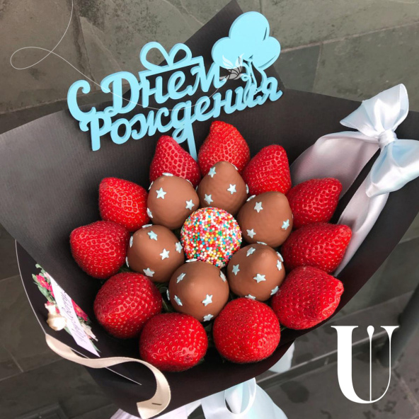 В данном размере букета помещается до 23 ягод отборной и крупной клубники. Средний вес букета- 600 г!