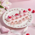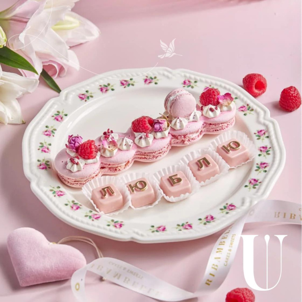 Состав: мука миндальная, пудра сахарная, сахар, белок куриного яйца, пюре кокоса с/м, пюре маракуйя с/м, шоколад, сливки 33%, молоко 3,2%, масло сливочное 82,5%, сыр креметте, малина свежая, ягоды сублимиованные, диоксид титана, краситель пищевой, розы сушеные.