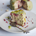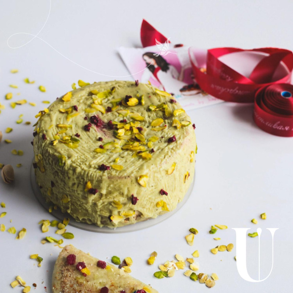 Песочная основа, декор из фисташки и сублимированной вишни.