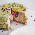 Состав: творожный сыр, сливки 33%, яйца, пшеничная мука, кукурузный крахмал, сливочное масло, сахар, ваниль, фисташковая паста, сметана 20% , сублимированная вишня, фисташка, белый шоколад, растительное масло.