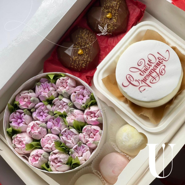 Классный подарочный набор десертов на день рождения - это коробка, в которой со рано огромное количество разнообразных сладостей! И невероятный букет из тюльпанов из зефира, сердечки дубайского шоколада, пирожные Моти и бенто торт с красивой надписью в честь праздника! Такой подарок точно запомнится вашему получателю и произведет приятное впечатление!