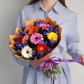Композиция из роз, гербер и альстромерий розового цвета в дизайнерской пленке