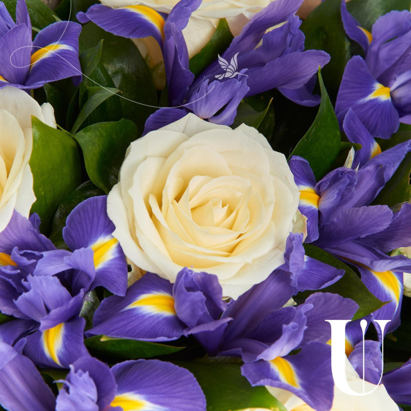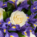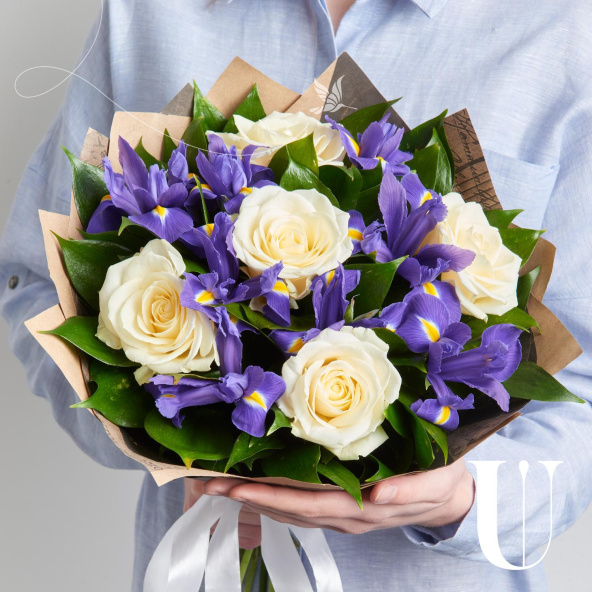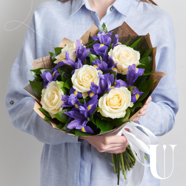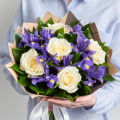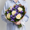 Авторский букет из роз Кантри Блюз, белой эустомы и розовой альстромерии в белой упаковке