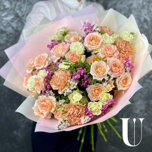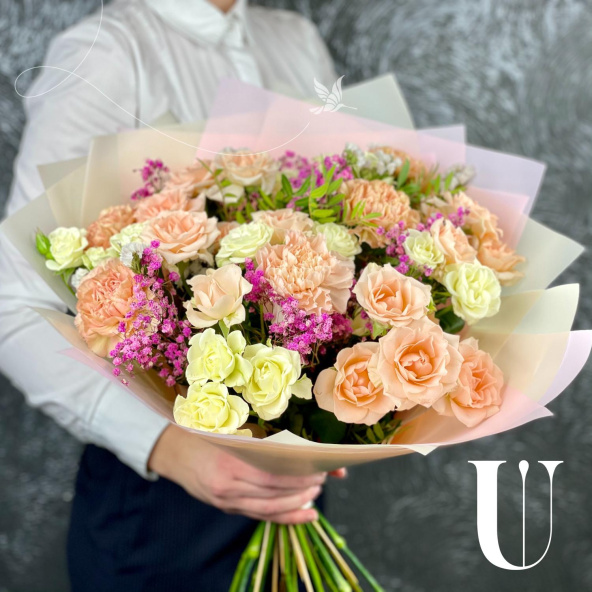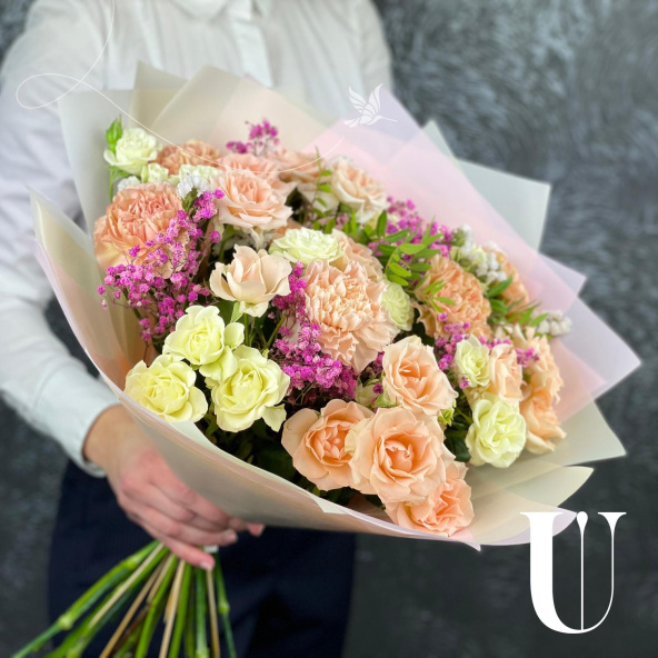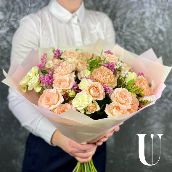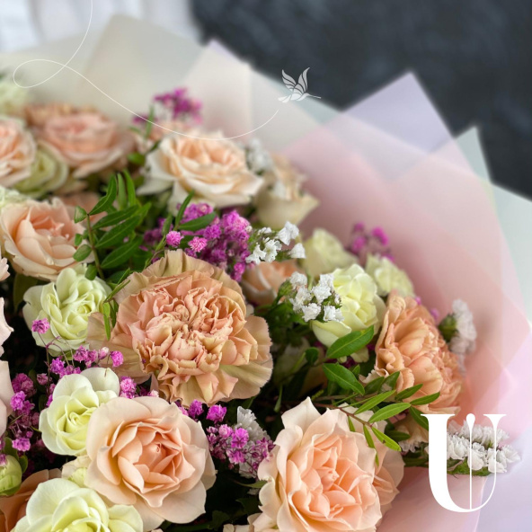Воздушный букет кустовых роз с гипсофилой, украшенный махровыми диантусами