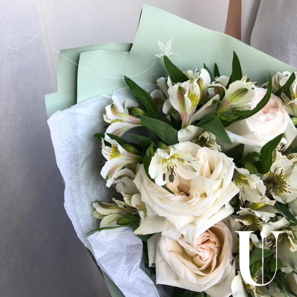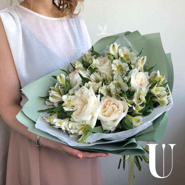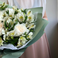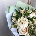 Букет из белых роз и кустовой хризантемы в стильной упаковке