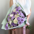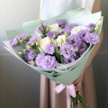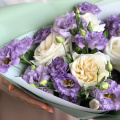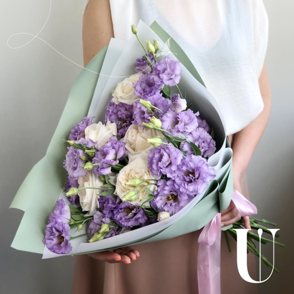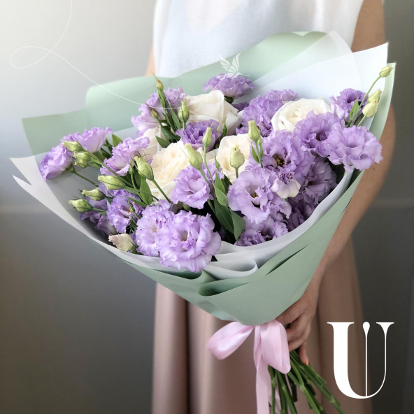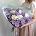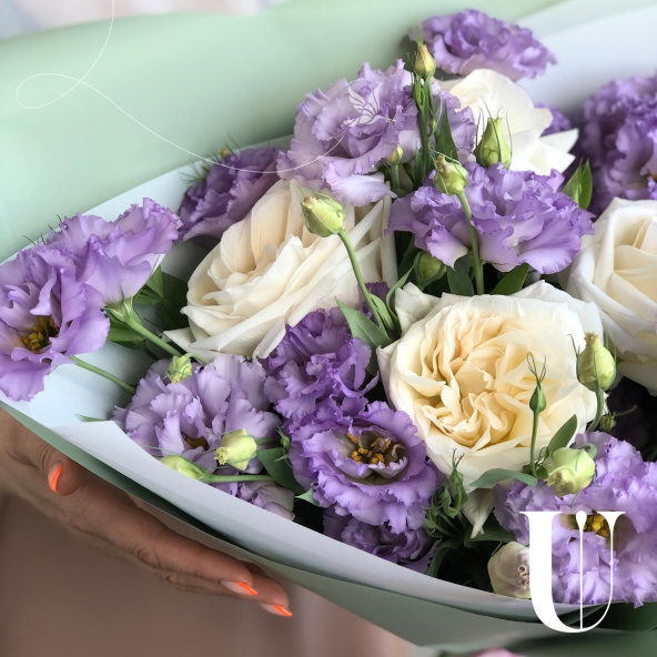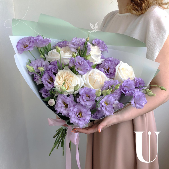 Воздушная, изысканная композиция с пионовидной розой и эустомой непременно порадует получателя