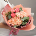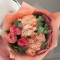 Авторский букет из диантусов Пинк, кустовой хризантемы и нежно-розовой кустовой пионовидной розы в упаковке