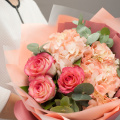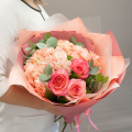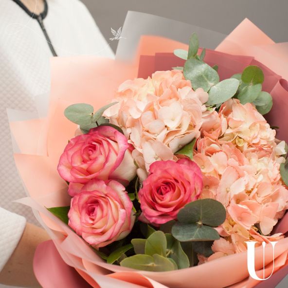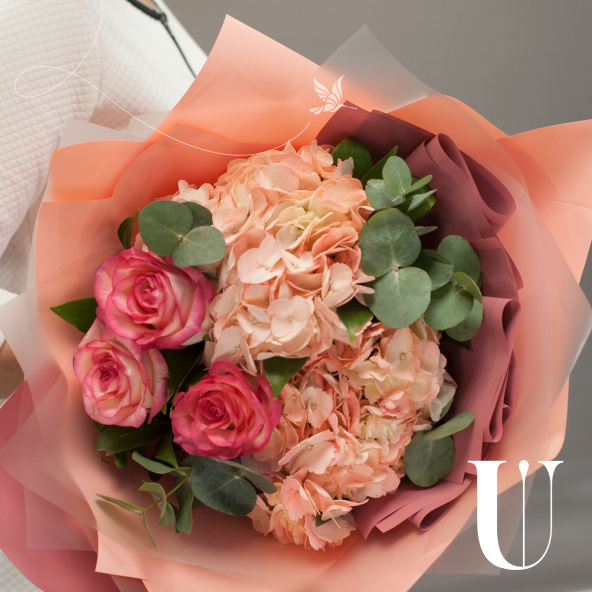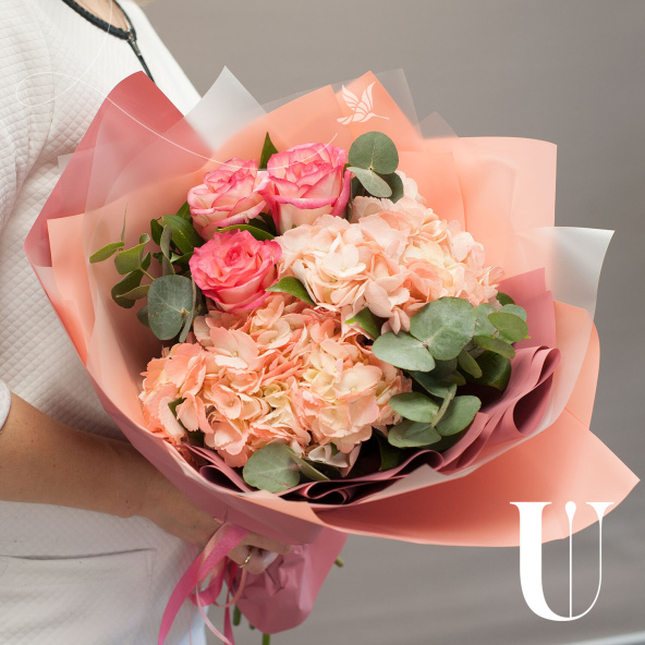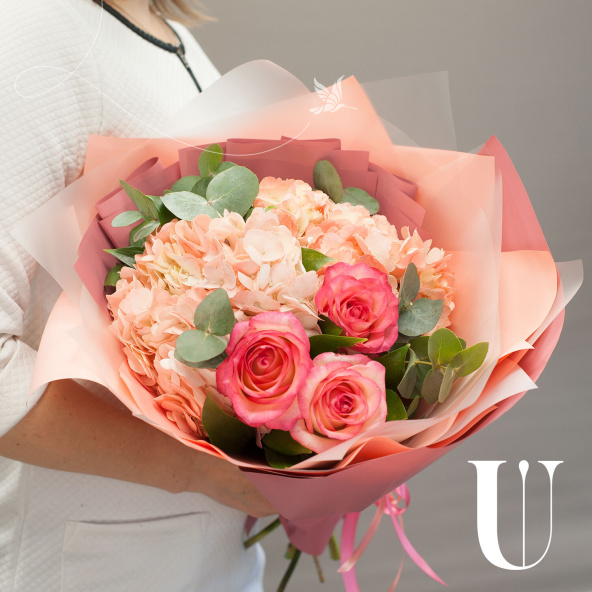 Классический букет из розовой гортензии и роз сорта Ангажемент в розовой упаковке