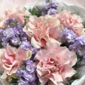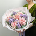 Букет из розовых диантусов , роз Шармант и розовых маттиол в упаковке
