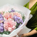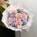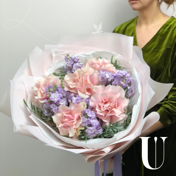 Монобукет из розовых гортензий и светло-фиолетовых диантусов в упаковке