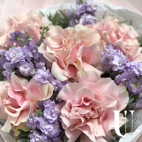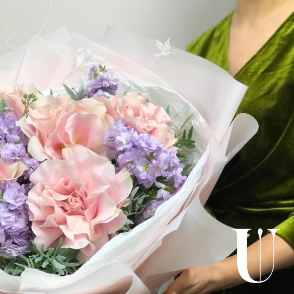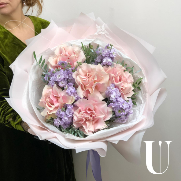 Букет из розовых кустовых роз и белых маттиол в упаковке