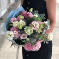 Букет в розовой гамме из кустовых роз и диантусов в упаковке
