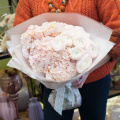 Дуэт букетов из розовой гортензии, кустовых роз и писташи в розовой упаковке