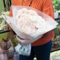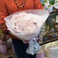 Букет из роз Джумилия, белых эустом и диантусов Пинк в дизайнерской упаковке