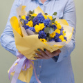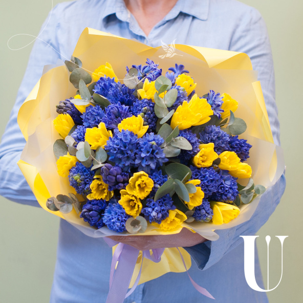 Букет состоит из 45 цветов, включая 25 синих гиацинтов и 20 желтых нарциссов. Зеленые ветви эвкалипта добавляют свежести и аромата, делая композицию еще более привлекательной.