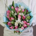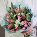 Букет из розовых диантусов и кустовых пионовидных роз Бомбастик в упаковке