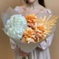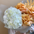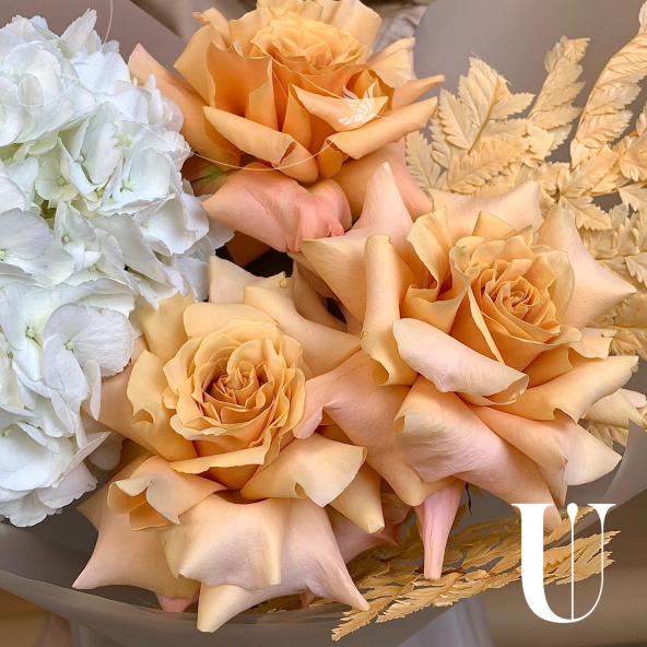 Этот букет - это воплощение тепла и света в сочетании с нежностью и легкостью. В его основе находятся пионовидные французские розы, гортензия добавляет легкости, а стабилизированный папоротник благородства и утонченности. Букет представлен в яркой, солнечной оранжевой палитре, создавая атмосферу радости и позитива.