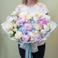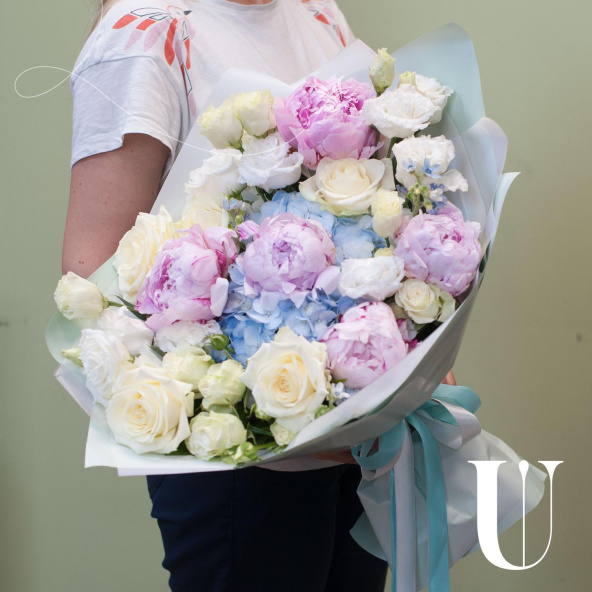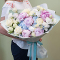 Букет цветов "Примадонна" - это изысканный и стильный подарок, который подойдет для любого повода. Он состоит из разнообразных видов цветов, включая гортензию, пион, эустому, оксипелатум, розу и розу кустовую, что делает его уникальным и привлекательным.
