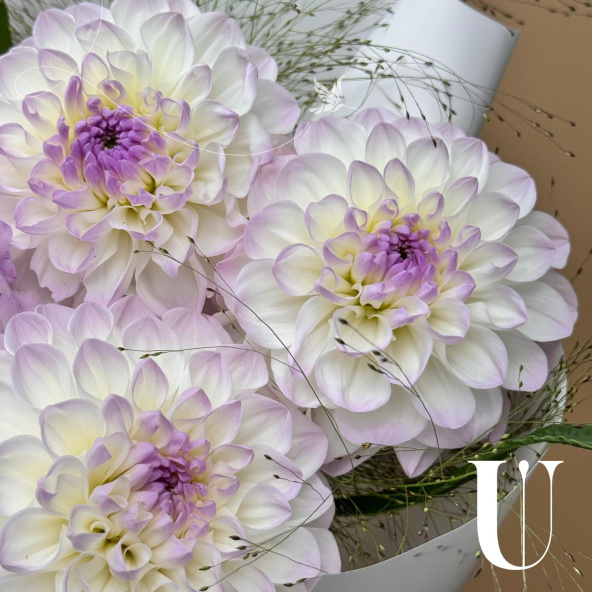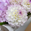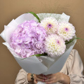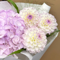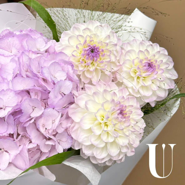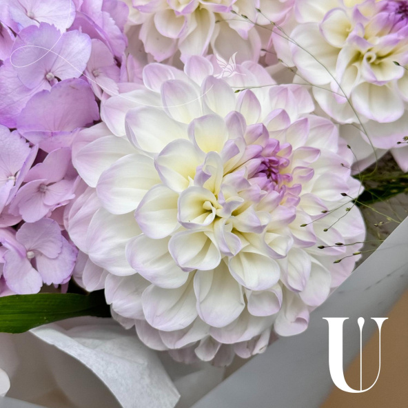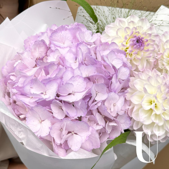 Букет «Свет Луны» состоит из георгин и лавандовой гортензии. Эти цветы создают нежное и гармоничное сочетание, напоминающее лунный свет. Георгины символизируют радость и счастье, а гортензии добавляют букету лёгкость и изящество.