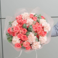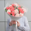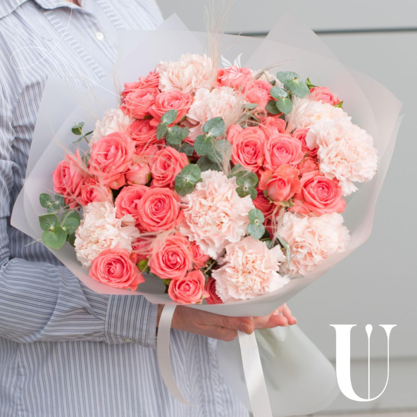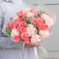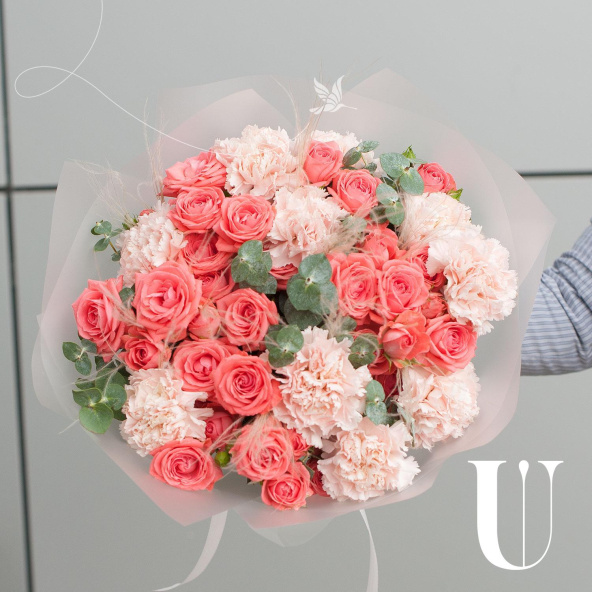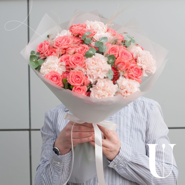Букет состоит из 17 цветов, включая гвоздику и розу кустовую. Оранжевый и розовый оттенки цветов создают теплую и уютную атмосферу, а разнообразие видов цветов делает букет еще более привлекательным.