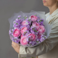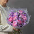Букет из кустовых пионовидных и кустовых роз микс в упаковке