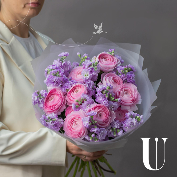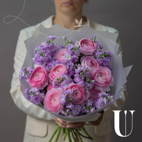Букет из розовых маттиол, белых орхидей и белых лизиантусов в упаковке