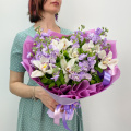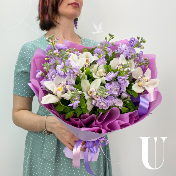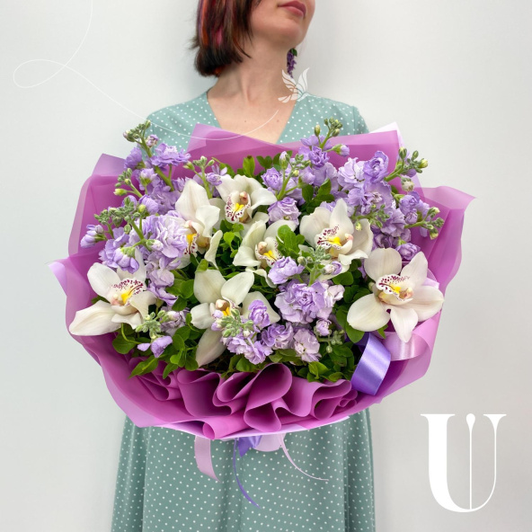 В центре композиции — семь величественных белоснежных орхидей, символов грации и утончённой красоты. Их хрупкая роскошь дополнена кустовой матиолой лавандового оттенка, которая окутывает букет легким облаком аромата и добавляет глубины и текстуры.