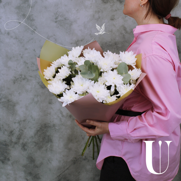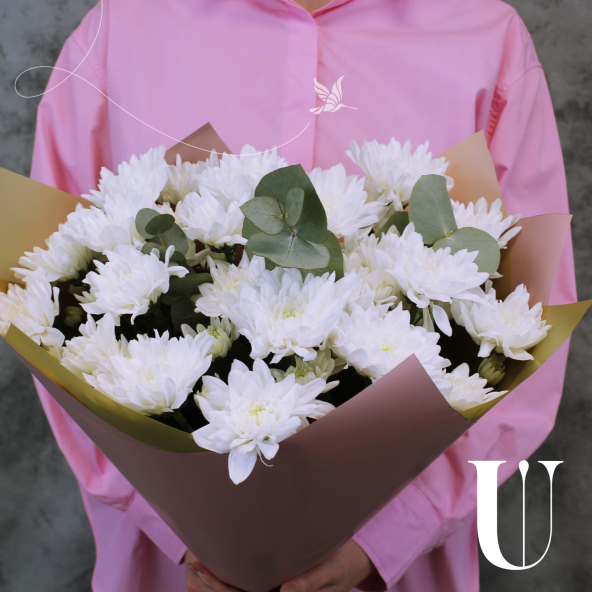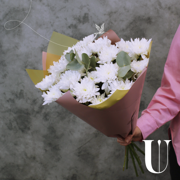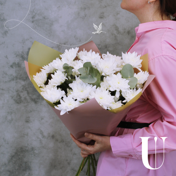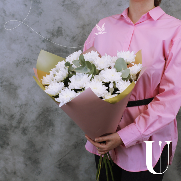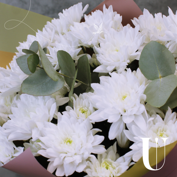 Выбирая классический сборный букет из 5 белых кустовых хризантем с эвкалиптом, Вы делаете прекрасный и запоминающийся подарок, который будет радовать получателя своей элегантностью и нежностью.
