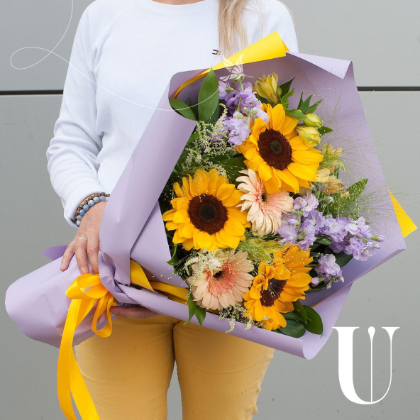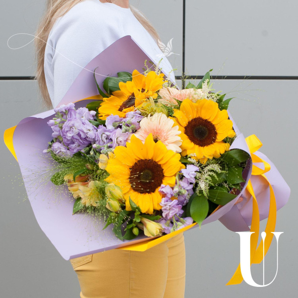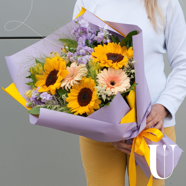 Букет состоит из 15 различных видов цветов, включая подсолнухи, маттиолу, герберы, астильбу, альстромерию, паникум и салал. Такое разнообразие позволяет создать яркую и запоминающуюся композицию, которая будет радовать получателя своей красотой и свежестью.