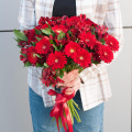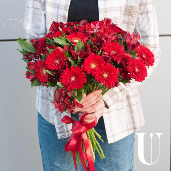 Букет выполнен в красных тонах, что делает его ярким и запоминающимся.