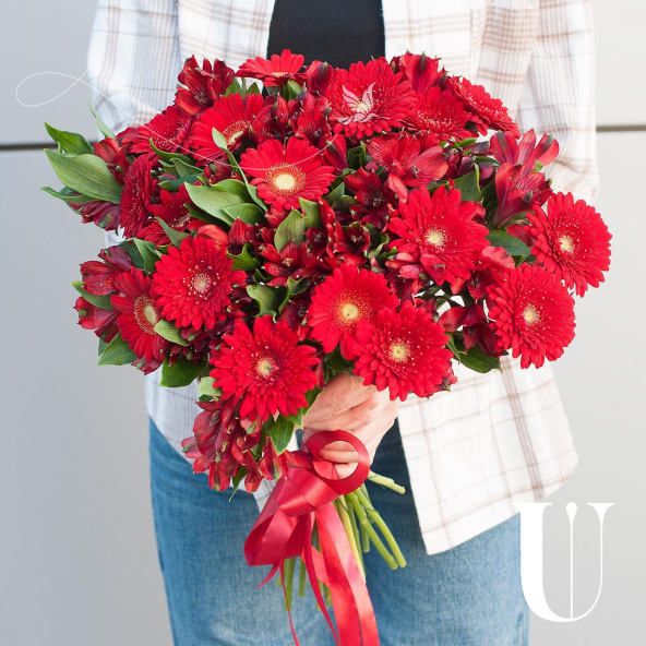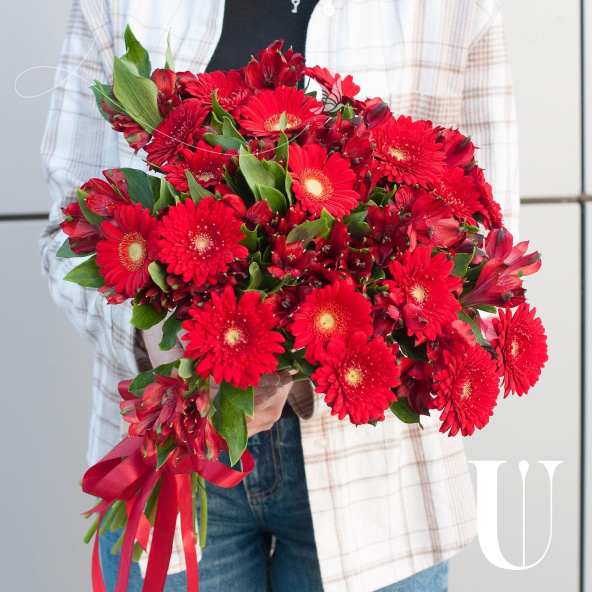 Букет цветов "Очаровательная Скарлет" - это сборный букет, состоящий из минигербер и альстромерий.