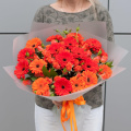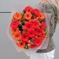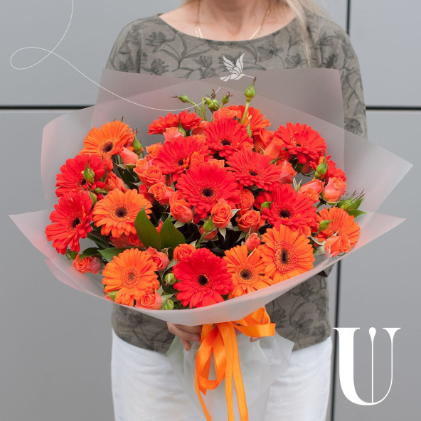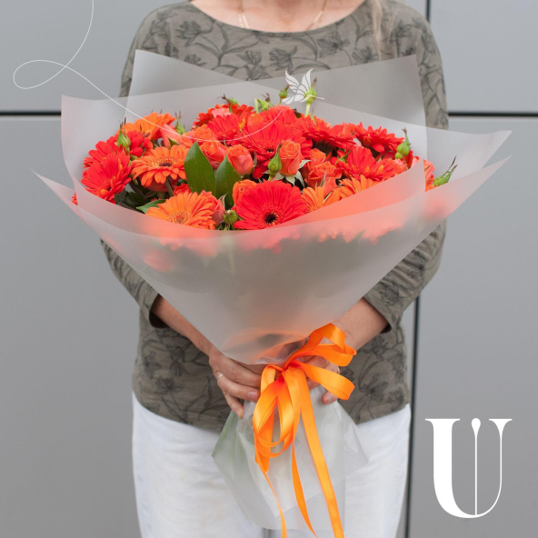 Букет "Оранжевое солнце" - это уникальное сочетание оранжевых минигербер и кустовых роз, которое создает неповторимую атмосферу тепла и радости.