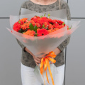 Букет оформлен в пленку, что придает ему законченный и стильный вид. Оранжевый цвет цветов и упаковки гармонично сочетаются, создавая яркий и запоминающийся образ.