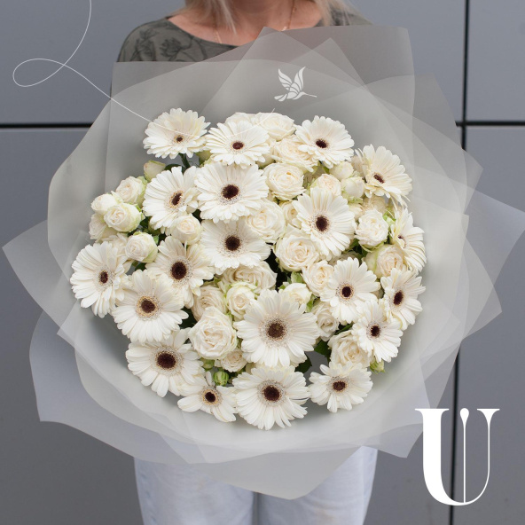 Выбирая букет в белой гамме из минигербер и пионовидных кустовых роз "Айс", вы получаете стильный, элегантный и качественный подарок, который будет радовать получателя своей красотой и ароматом.