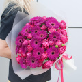 Букет в лиловых тонах "Присцыла" - это сборный букет, состоящий из 29 минигербер, 20 пионовидных кустовых роз и оформленный в пленку.