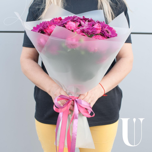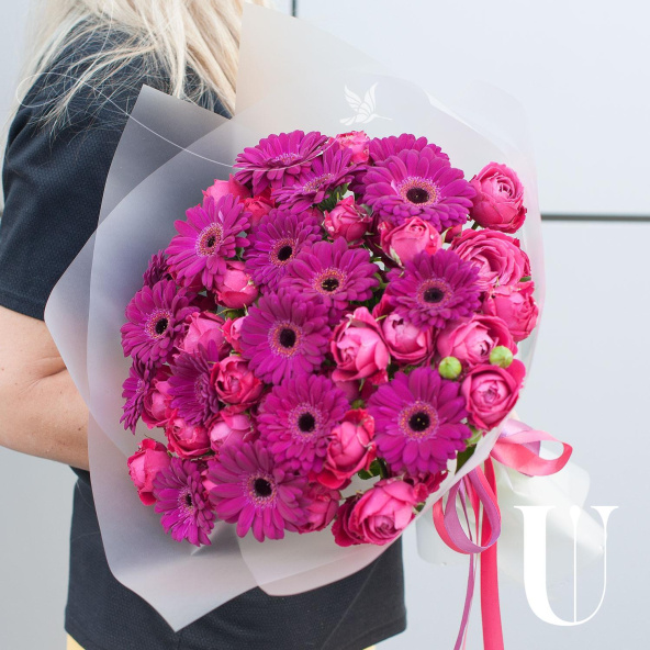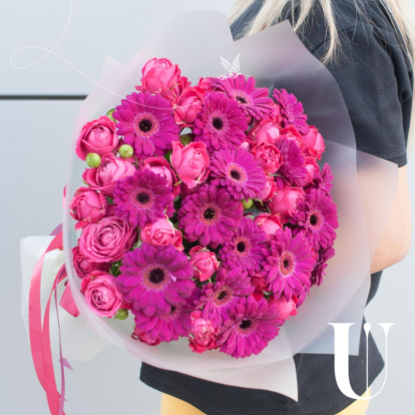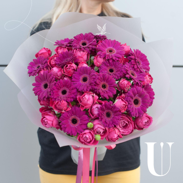 Особенностью этого букета является его состав. В нем представлены три вида цветов: минигербера, роза кустовая и роза пионовидная. Такое сочетание делает букет ярким и насыщенным, а также придает ему неповторимый аромат.