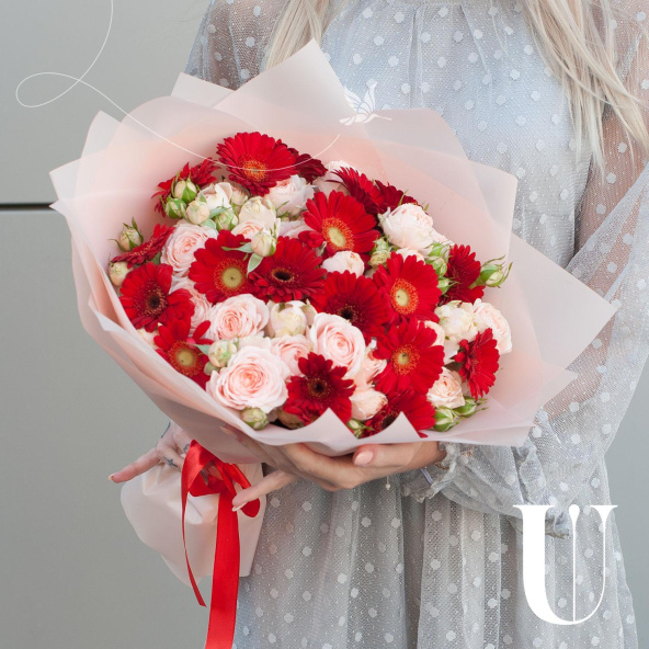 Букет состоит из 29 цветов, включая 19 минигербер красного цвета и 10 кустовых роз бежевого оттенка.