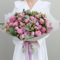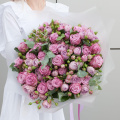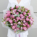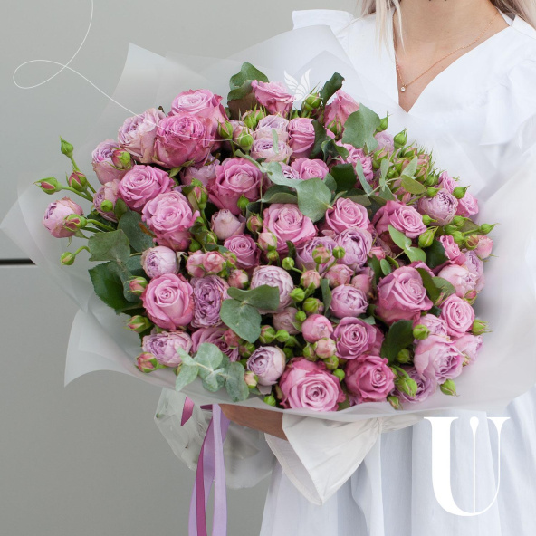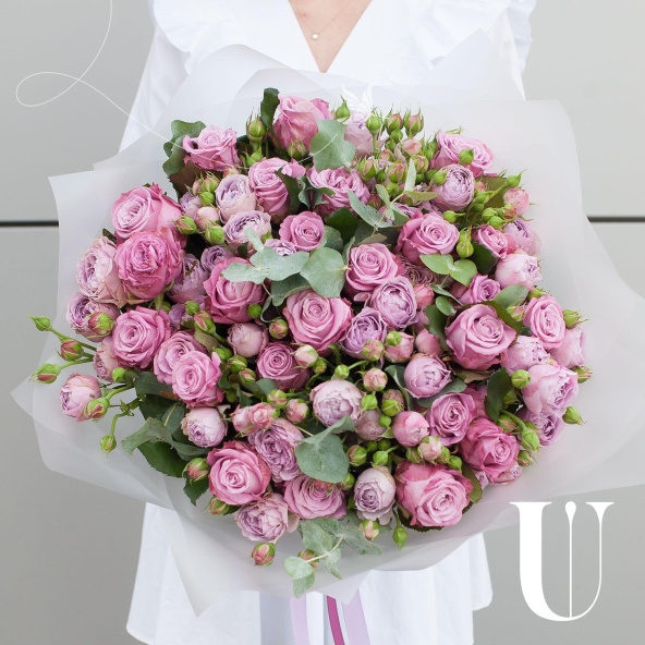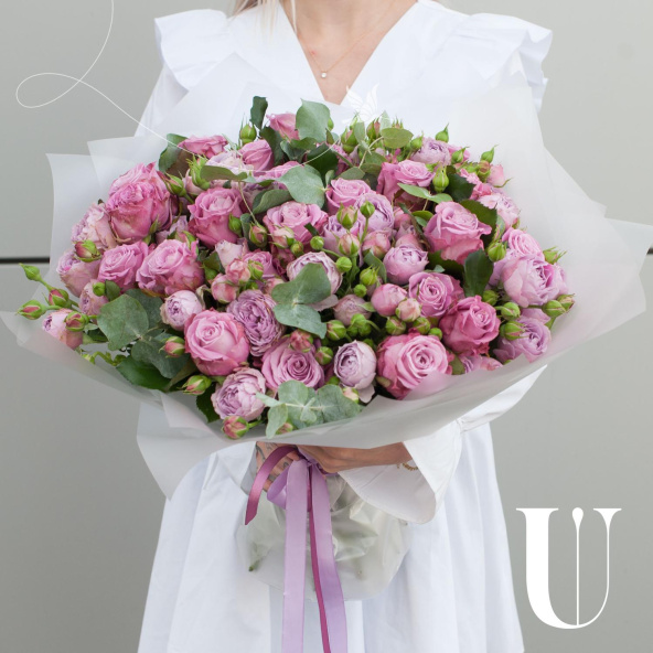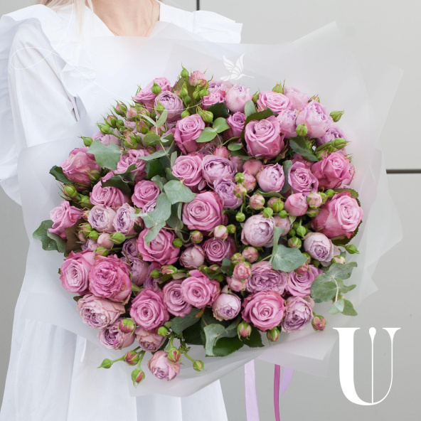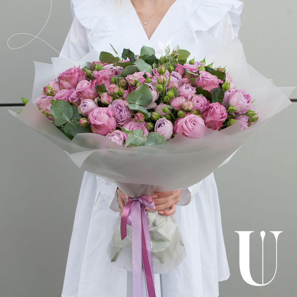 Букет оформлен в сиреневой гамме, что придает ему нежный и утонченный вид. В составе букета 35 цветов, включая 25 одноголовых и кустовых роз, 10 пионовидных роз и ветви эвкалипта.
