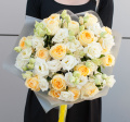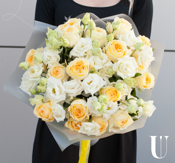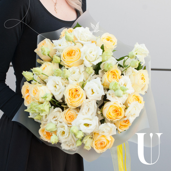 Букет цветов "Медовый" - это сборный букет, состоящий из 27 желтых роз и 10 белых лизиантусов.