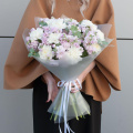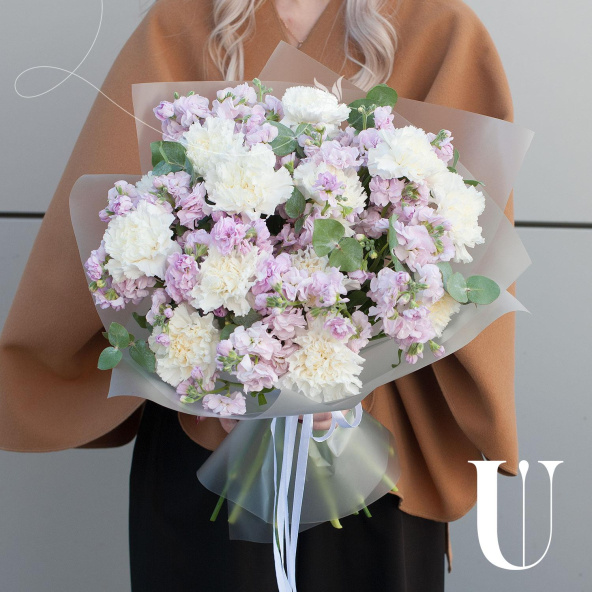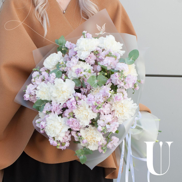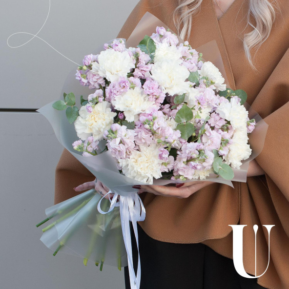 Букет состоит из 25 свежих и ароматных цветов: 15 белых гвоздик и 10 розовых маттиол. Зеленые ветви эвкалипта добавляют свежести и гармонии в композицию.