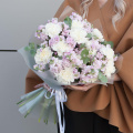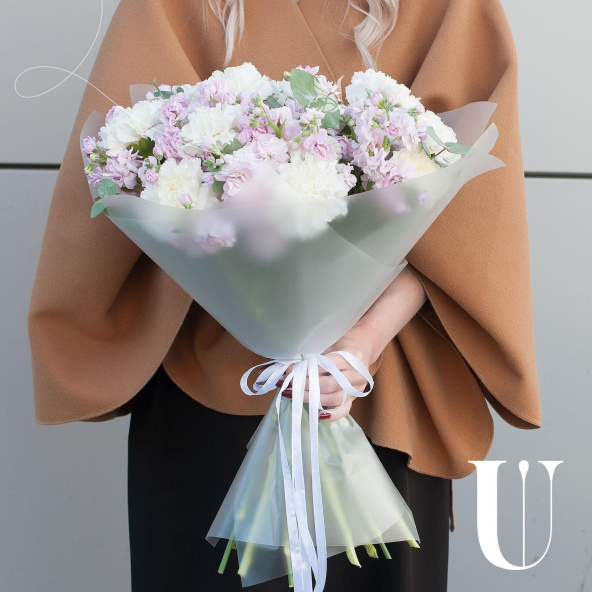 Букет из белых гвоздик и розовой маттиолы в подарочной упаковке "Облачно-воздушный" - это стильный и элегантный выбор для любого повода.
