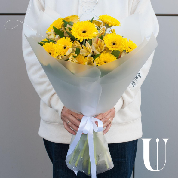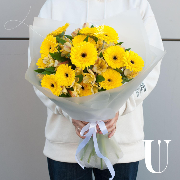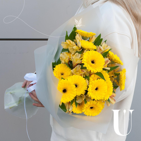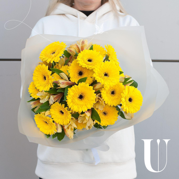 Букет состоит из 17 желтых минигербер и 10 желтых альстромерий, что делает его ярким и запоминающимся. Герберы и альстромерии - это цветы, которые отличаются своей стойкостью и продолжительным сроком жизни, что гарантирует свежесть и красоту букета на протяжении долгого времени.