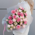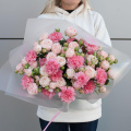 Букет цветов "Принцесса грация" - это сборный букет, состоящий из пионовидных кустовых роз, розовых гвоздик и гвоздики.