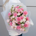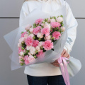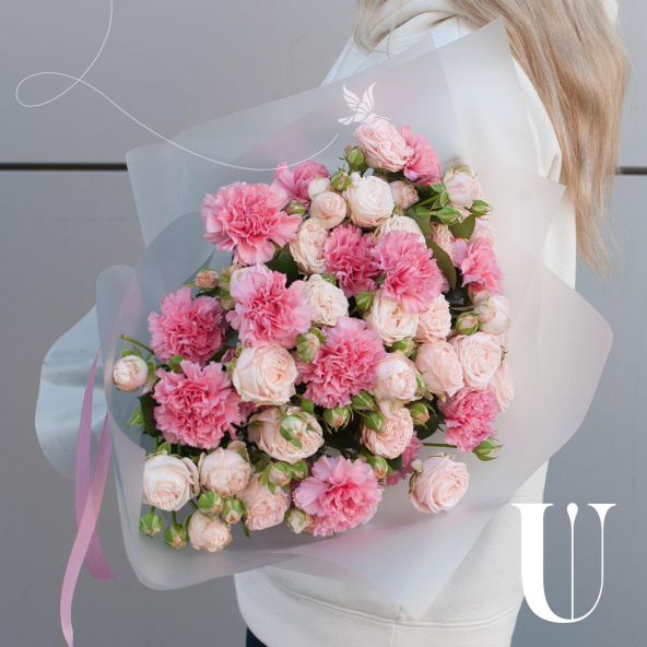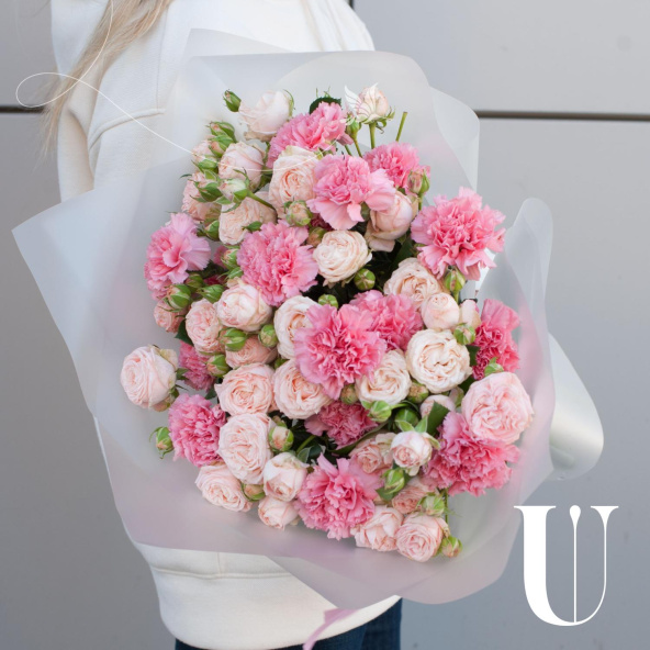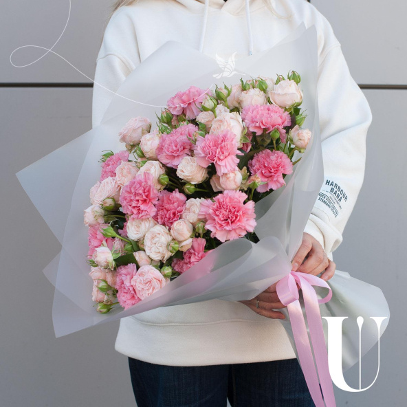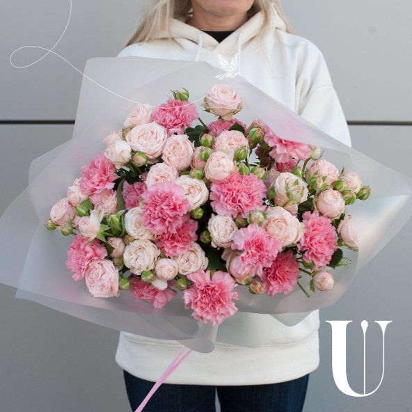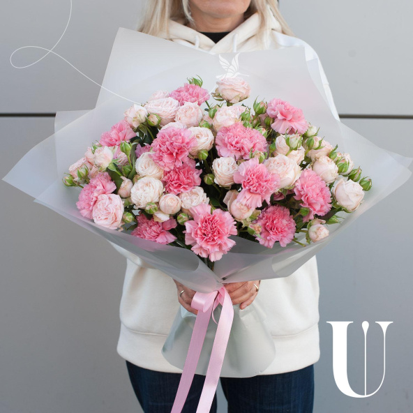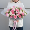 Букет оформлен в розовом цвете, что делает его ярким и запоминающимся. В составе букета 25 цветов, включая 17 розовых гвоздик и 8 пионовидных кустовых роз. Высота букета составляет 40 см, что делает его достаточно большим и заметным.