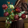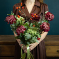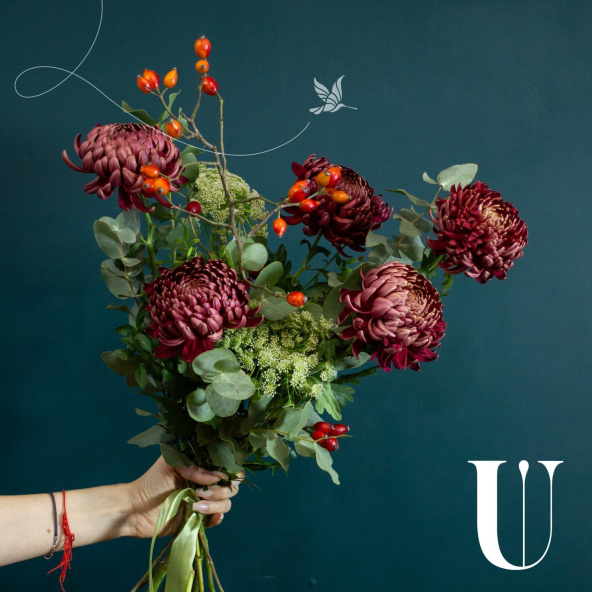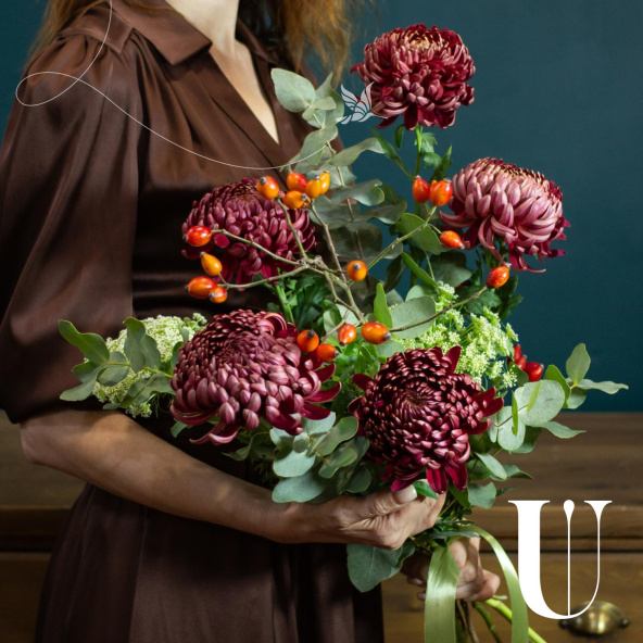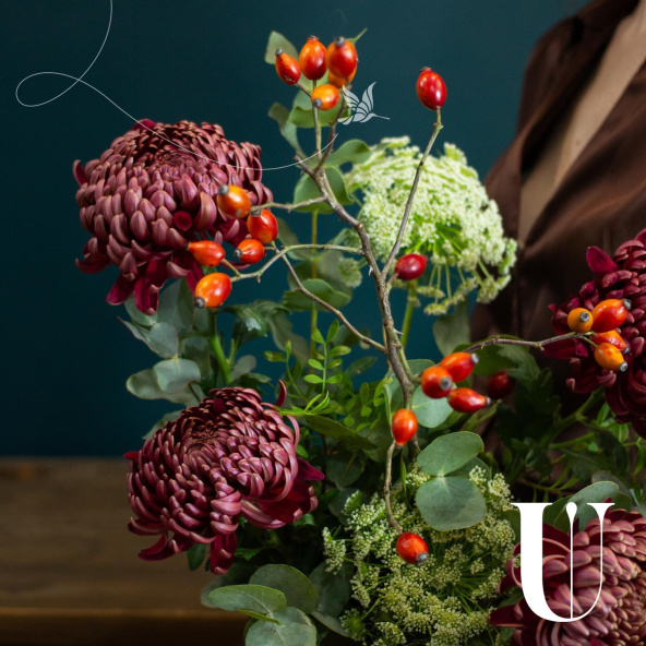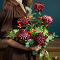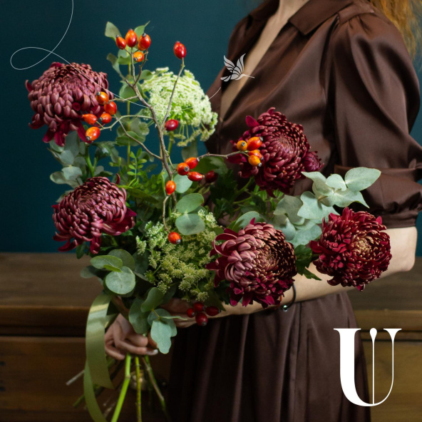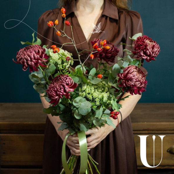 Подарите настоящее осеннее настроение с букетом «Лесная ягода». Глубокие коричнево-бордовые оттенки дарят спокойствие и уют, как прогулка по лесу в золотую пору. Пышная хризантема-бигуди, дикий шиповник и кружева амми создают сложную игру фактур, которую так приятно рассматривать. Этот букет — не просто цветы, а готовое чувство тепла и заботы, которое станет самым запоминающимся подарком.