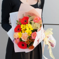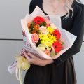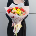Букет "Яркие краски осени" - это сборный букет, состоящий из 11 видов цветов, включая розы, минигерберы, хризантемы, гвоздики, альстромерии и листья салала.