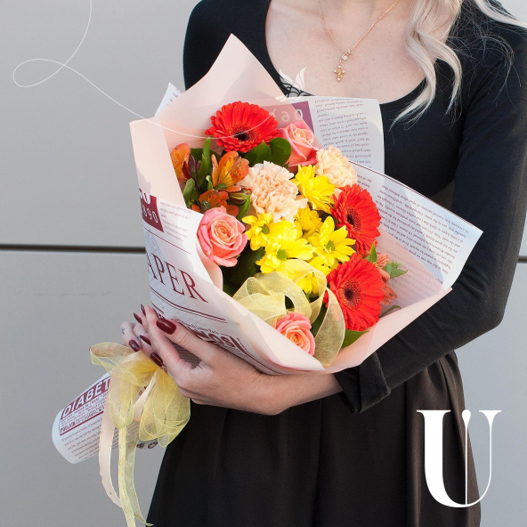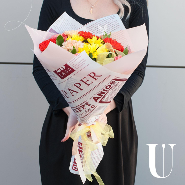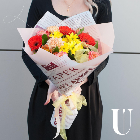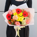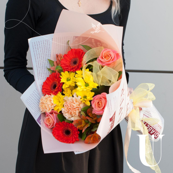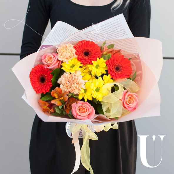 В составе букета - 3 розы, 3 минигерберы, 1 кустовая хризантема, 2 гвоздики, 2 альстромерии и 1/3 пачки листьев салала. Сборка букета осуществляется на стеблях, что обеспечивает его устойчивость и долговечность.