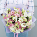 Букет из белых калл и розовых лизиантусов в дизайнерской упаковке "Рози" - это стильный и элегантный подарок, который подойдет для любого повода.