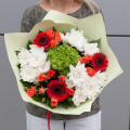 Букет цветов "Манакара" - это сборный букет, состоящий из хризантемы, гортензии, кустовой розы и минигербер.