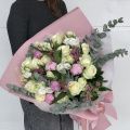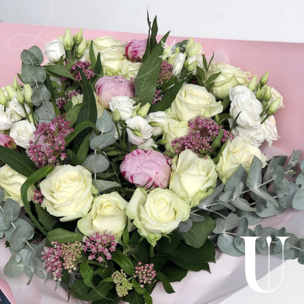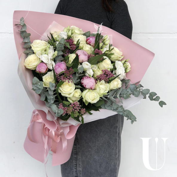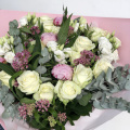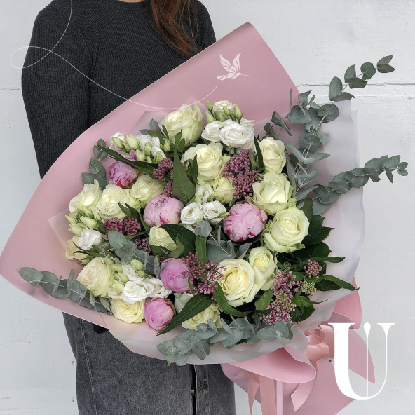 Большой букет из кустовых пионовидных роз Мисти Бабблз и роз Вайт Охара в дизайнерской упаковке